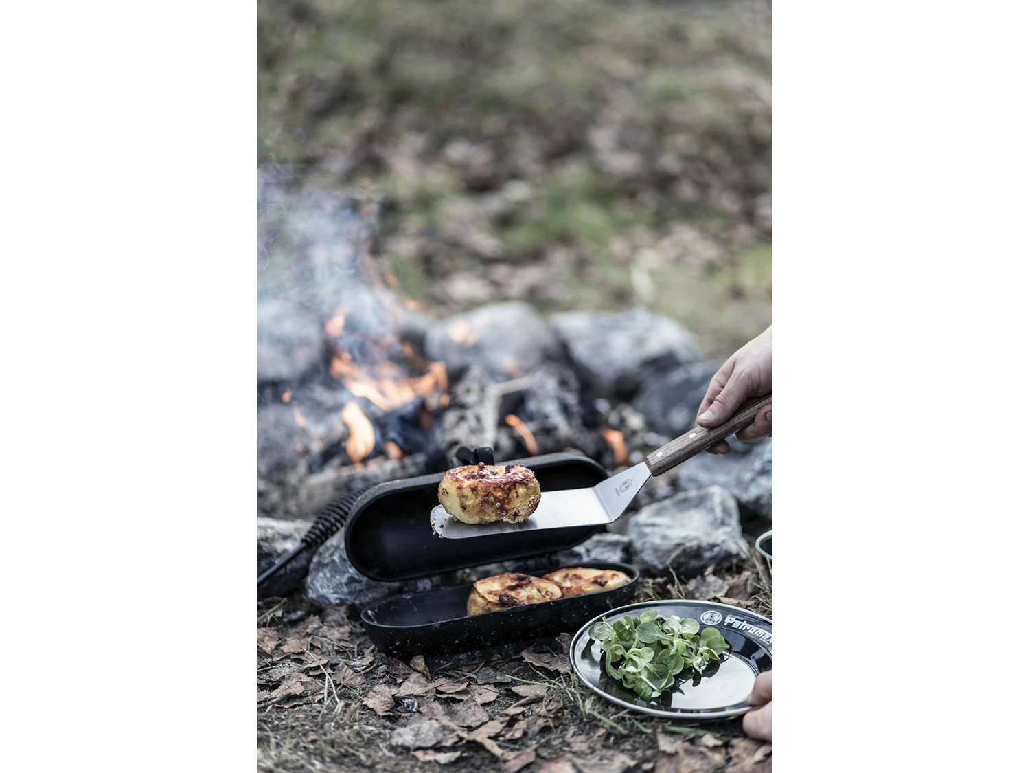 Het houten handvat ligt lekker in de hand en het roestvrijstalen spatelblad loopt taps toe aan het uiteinde, hierdoor kom je gemakkelijk onder je lekkere stukje vlees, vis of groenten. Deze Petromax spatel is perfect in de keuken, op een bakplaat of natuurlijk tijdens het buitenkoken op wat voor onderstel dan ook.